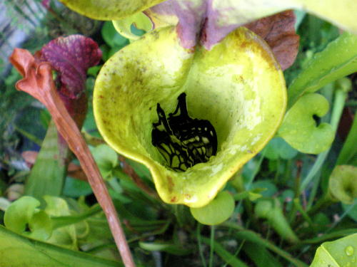 サラセニアには結構色々な虫が入りますが、やはり蜜でおびき寄せるため、花の蜜を吸いに来る虫が良く入ります。