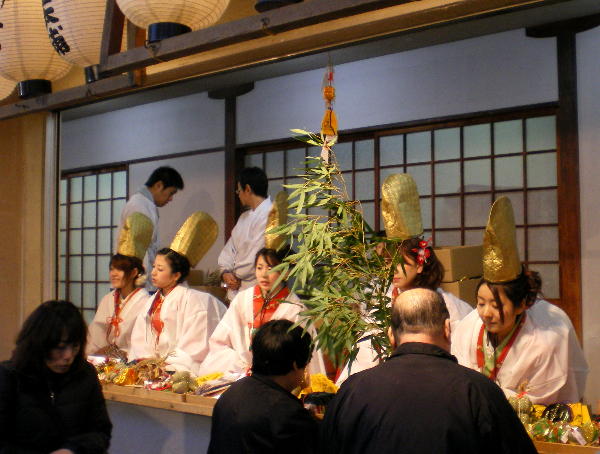 例によって境内には福娘が縁起物を売っていますが、いつもは次から次に来る人に忙しそうに縁起物を売っているのを見ていましたが、これだけ人が少ないと暇そうにしていました。