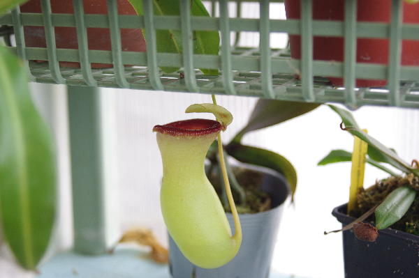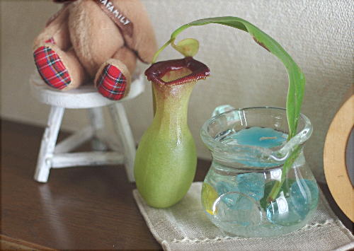 サラセニアの葉などは切ったら花瓶にでも挿せば良いんですが、ネペンの場合はそんなわけには行かないので、小さな瓶に水をいれてそこに葉を挿してツボを横に置きました。