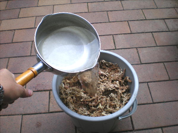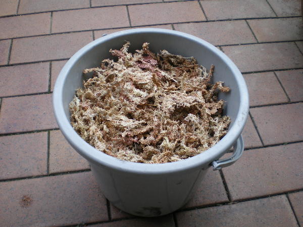 他にも植替えがあったので乾燥ミズゴケを戻しました、とりあえずバケツに乾燥ミズゴケを入れて・・・。