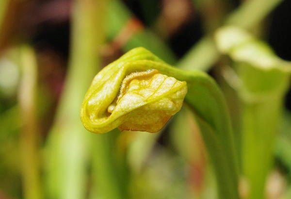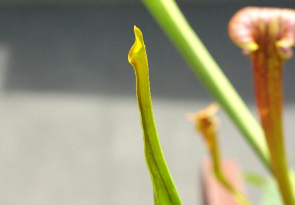 そんな中、サラセニアを見ているとかなり被害が出ていました、この様子から見るとはダニのような感じですが、雨続きの梅雨にハダニが発生すると言うのも珍しい気がしますが、スリップスとは様子が違うし、この縮れ方はやはりハダニでしょうね~・・・。