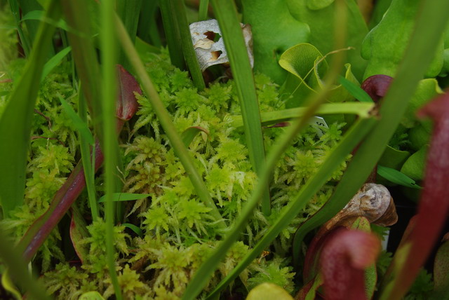 サラセニアの鉢には生長促進のために、鉢の上に生ミズゴケを置いています。
