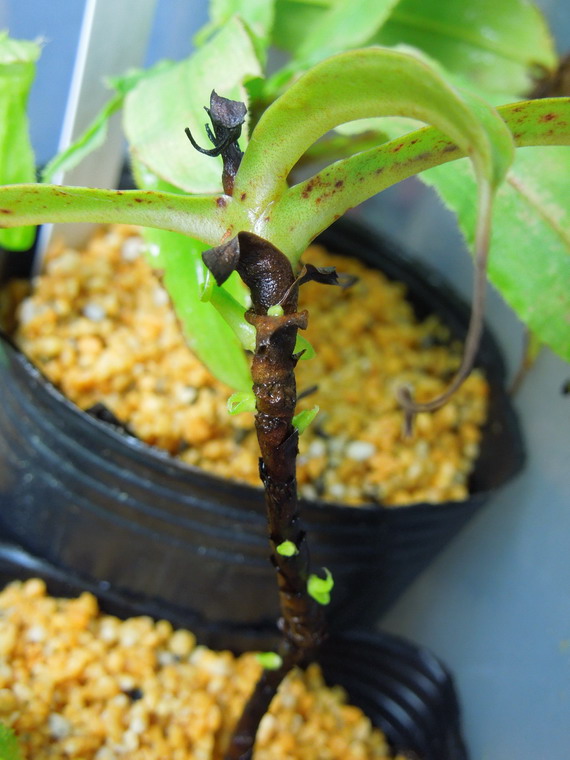 多分、主成分の砂糖水がきいているんだと思うが、頂芽が駄目になったネペンでも枯れることも無く新芽が大量に出てきた、これは驚きである。