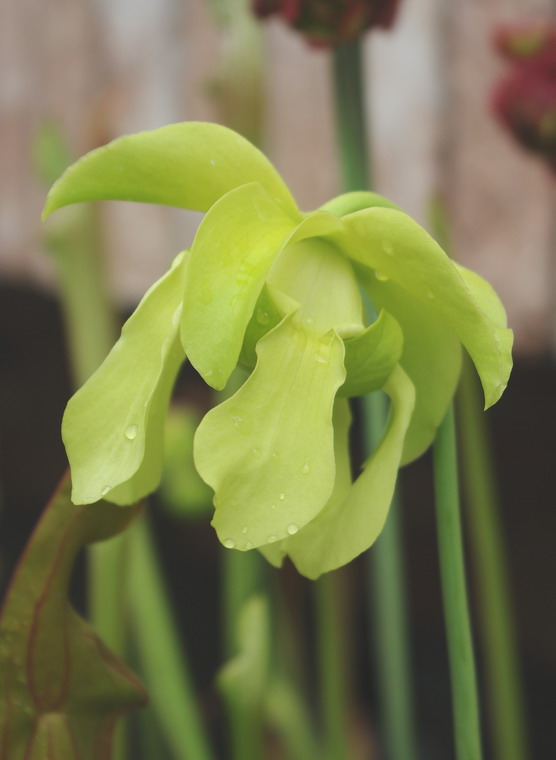 サラセニアの花は、雨が降っても弱い雨なら花粉が濡れないような構造になっていますが、風が強く吹降りが激しいと花の中まで濡れてしまいます。