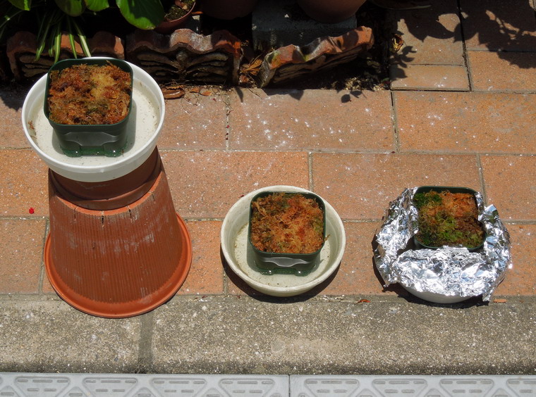 通常植え込む時と同じようにミズゴケを入れた鉢を3個用意して、左から台を置いてコンクリートの床からの輻射熱を和らげる工夫をした物、全く何もせずにそのまま置いた物、腰水に太陽光が直接当らないようにアルミホイルを巻いた物。