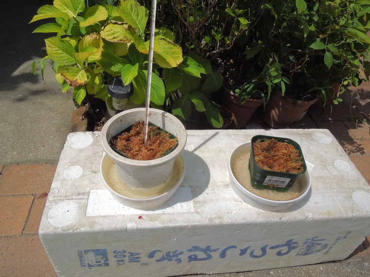 結果、これくらいではあまり大きさに差がないので温度差もあまり出ず、日差しも途中で曇ったりして温度もそれほど上がらずでしたが、大きな鉢が 37℃で小さな方が38℃と、それでも1℃の差は出ました。
