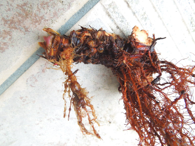 新しい根と茎だけがやられていると言うことと、他から進入することが考えられないので、どうも植え替えの時に入ったようです。