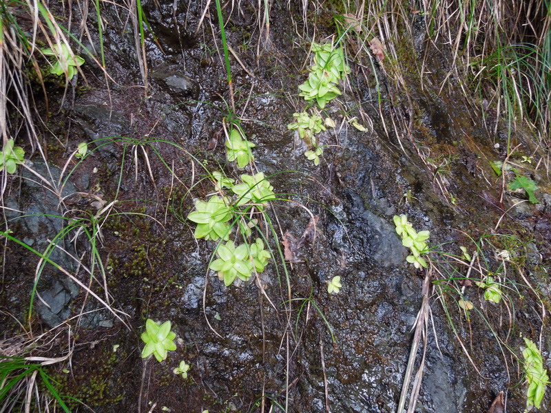 ムシトリスミレが生えている所は草が生えてきて、ほとんど岩壁を覆うような形になっているため、草の間で日当たりがあるようなところを選んで生えています。