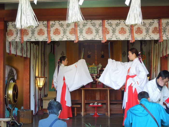 神社なので巫女さんもいますが、何やらちゃんばらをしていました・・・。 (^^ゞ