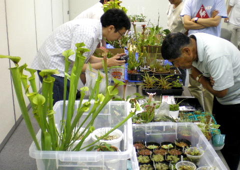今回は会場の前の部屋で資産運用セミナーが開かれていた為、スーツ姿の会社員が並ぶ横を、サラセニアやネペンを乗せた台車を押して通る一団は非常に場違いな感じでした。