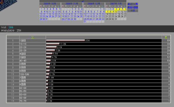 左のグラフは訪問回数ですが、3割ほどの人は一回だけなので興味のない人だったようです、その他数回と言う人が多い中100回以上と言う人もいます、日々あちこちめくっているんでしょうか・・・。