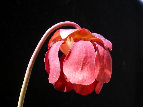 一連のサラセニアの花の最後に咲くのがS.psittacina です、色は赤くS.leucophylla の花に似ています、大きな違いは大きさがS.leucophylla の半分ぐらいしかないと言うことと、雌しべが白っぽいと言う事です。