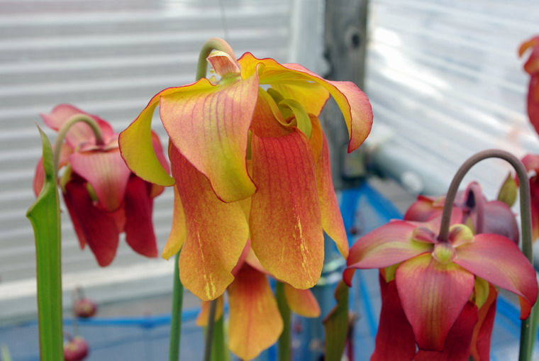 サラセニアの原種は黄色か赤の花ですが、交配種になると中間的な色のなることが多いようです、また花弁の特徴なども遺伝することが多いので、親がどの原種か分からない物でも有る程度見当をつけることが出来ます。